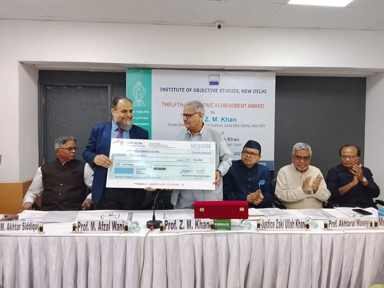 The Institute of Objective Studies (IOS) on Wednesday conferred its prestigious Lifetime Achievement Award upon noted scholar, author, and teacher Professor Zahoor Muhammad Khan, former Dean of the Faculty of Social Sciences at Jamia Millia Islamia and former Secretary General of IOS. The award, consisting of a citation, a memento, and a cash prize of ₹1 lakh, was presented to him by distinguished guests during a solemn ceremony held in New Delhi.